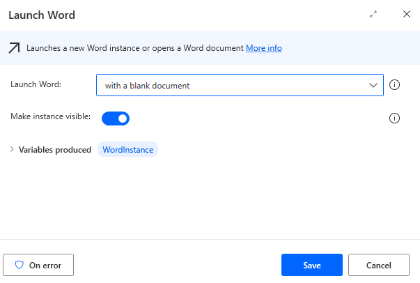To begin with we have to save launch word action with a blank document in flow as shown in image below.