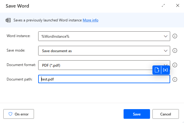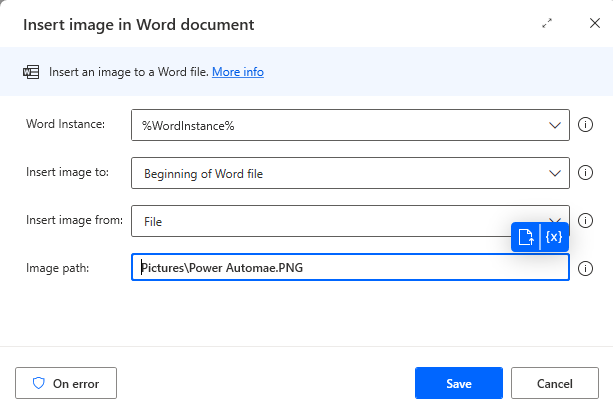 3.Save Word Action in Power Automate convert Image to PDF: