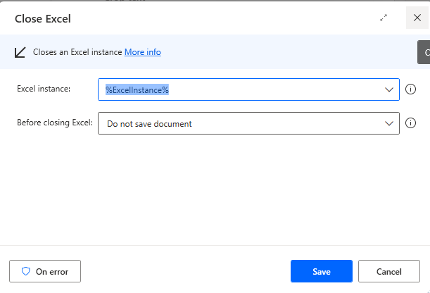 Close Excel Action in power automate will close opened excel file.we need to specify excel instance that need to close.excel instance must be specified previously and in Before closing excel we need to specify whether and how to save the document of this instance before closing that instance.we can select from 3 option from drop down.