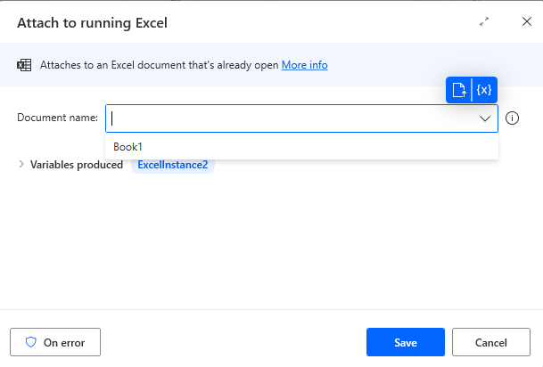 With the help of action attach to running excel we can attach or work with already opened excel notebook in our flow.It will automatically display opened excel file name in document name field if no excel file is opened it display none.