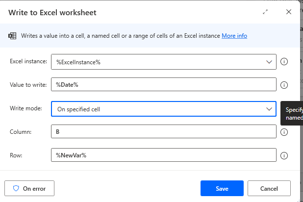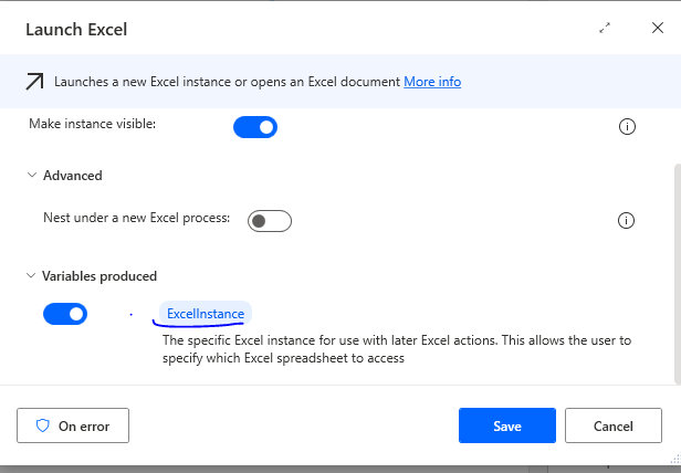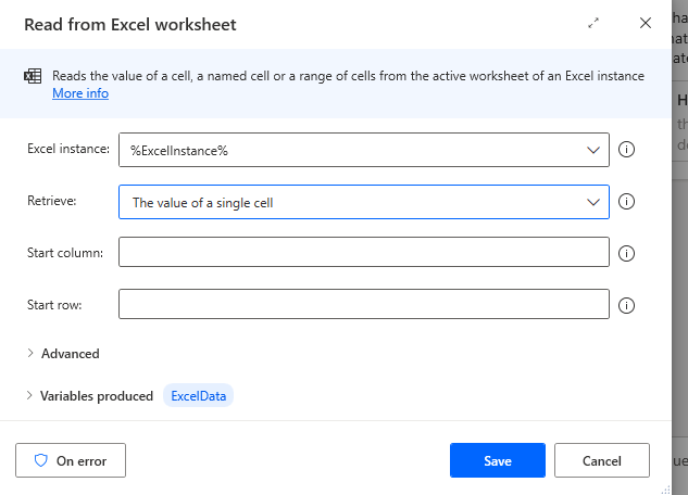 - Excel instance: Use the variable from the Launch Excel step.