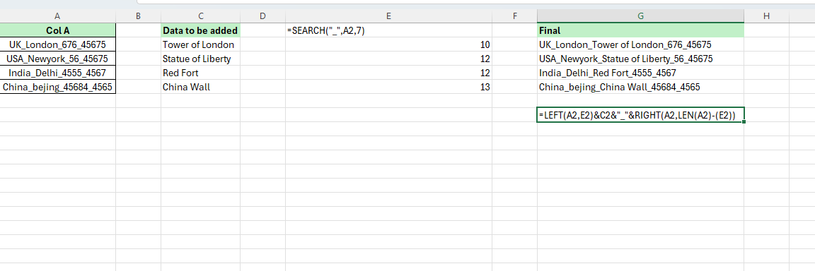 - In example above we have to insert data after the second underscore present in col A.so first using search formula we have found the position of the 2nd underscore as shown in image above.