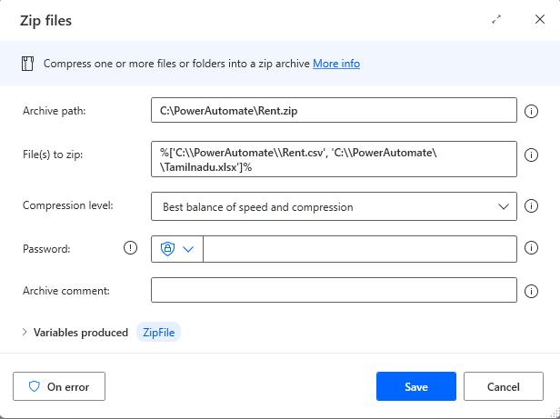 Above image shows how to use action zip file in power automate to Compress any files to zip file.As we can see in above image zip action has 4 input need to be filled.