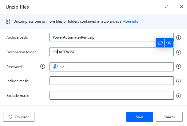 Now we have to just click on save and run this flow.The archive zip file will be unzipped in destination folder.